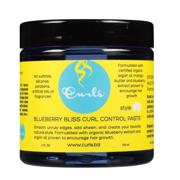 Blueberry Bliss Curl Control Paste Smooth unruly edges, add sheen and define your curls all in one! Formulated with organic blueberry extract, argan oil (proven to encourage hair growth) mango and shea butter, argan oil, Blueberry Bliss Curl Control Paste smooths and slicks down unruly edges, creating the most luxurious sheen! Use this super sculpting pomade to enhance, define and hold your curls. TIP - Use on wet hair for a soft hold or on dry hold for a strong hold. No sulfates, silicones, parabens, artificial oils, colors, or fragrances.