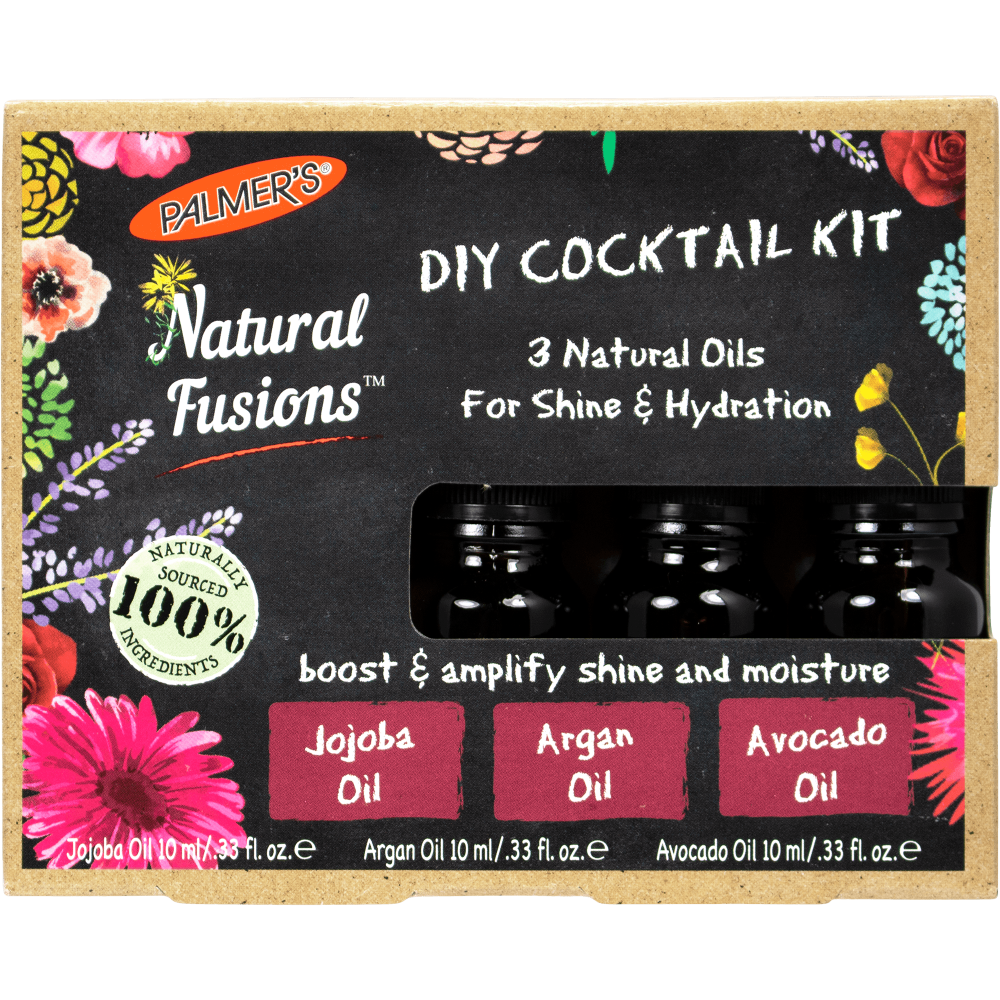Be your own hair mixologist! Palmer's® Natural Fusion kit takes the guess work out of DIY home-blended concoctions. Each kit contains three 100% natural oils, Jojoba, Argan and Avocado, that can be cocktailed into your favorite hair products as a booster for superior shine& amplified hydration.